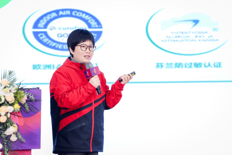环保矩阵则由技术部产品认证经理姜利红重点阐述。她从消费者最关心的健康与安全出发,详细的介绍了华彩在环保维度上的整体布局,全线产品在VOC释放量、气味等级等关键指标上,均按照远高于一般产品的标准执行,并先后通过了世界四大严苛环保认证:欧洲Eurofins室内空气质量IAC金级认证、芬兰防过敏认证(本产品与芬兰过敏、皮肤和哮喘联合会合作开发)、美国UL室内空气质量绿色卫士GREENGUARD [金级]认证、芬兰建筑材料释放等级认证M1级。