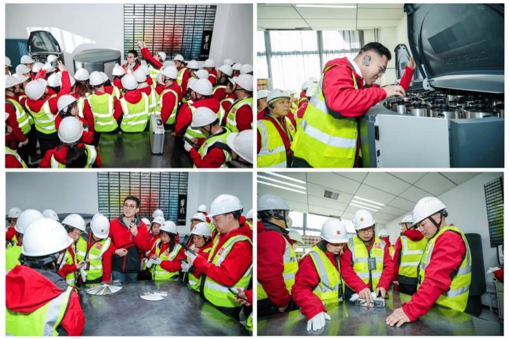 随后,经销商一行走进环境与气味评价实验室、恒温恒湿实验室、VOC 释放测试环境舱、化学分析实验室以及重金属检测平台等功能区域,全面了解华彩漆从原料、配方到成品出厂的“全链路检测”体系。严苛的实验条件与标准化的测试流程,让大家对华彩在环保、安全维度上的“高标准、自我加码”有了更直观的认知。