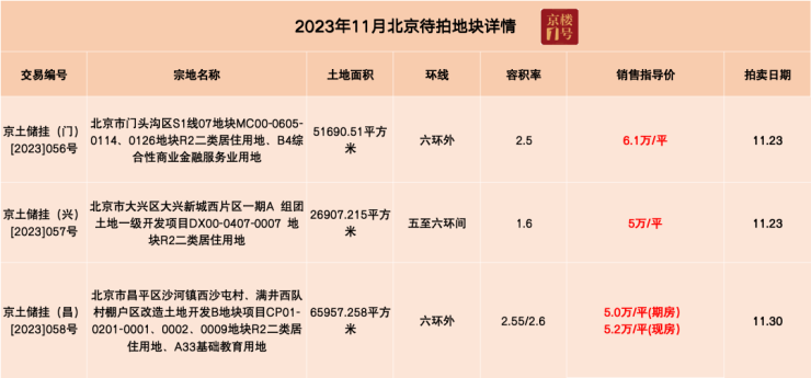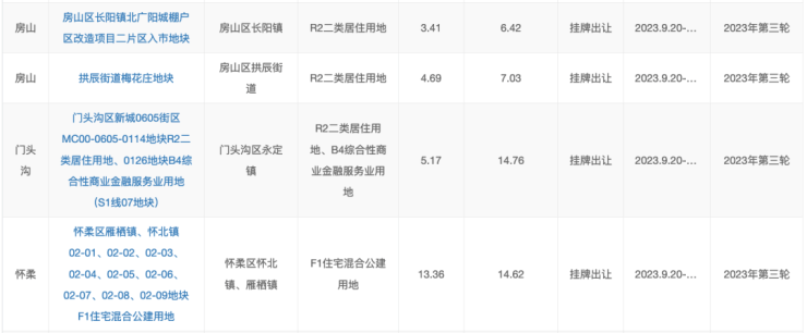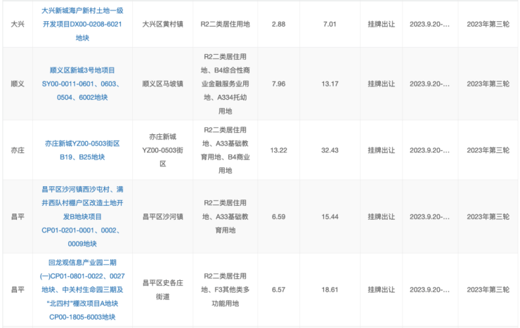 昌平、房山、大兴、临空经济区(大兴)均有两宗地供应;