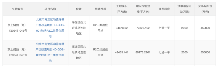 其中,京土储预(海)〔2024〕045号地块为北京市海淀区功德寺棚户区改造项目HD-GDS-001地块,地块用地性质为R2二类居住用地,地上建筑规模72825.102平方米,交易起始价45亿元,折合起始楼面价61792元/平方米。