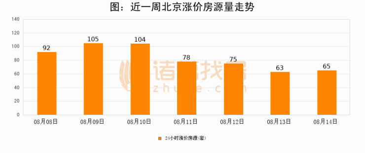 根据诸葛找房数据显示,北京24小时涨价房源量为65套,较08月13日增加2套,环比上涨3.2%。与此同时,涨价房源占比小幅扩大,业主信心有所提升。