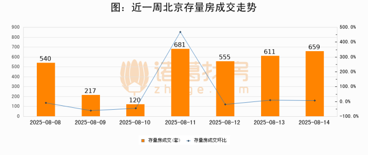 从存量房来看,2025年08月14日北京存量房单日成交659套,比昨日增加48套,环比上涨7.9%。从近一周存量房成交来看,北京存量房日均成交套数为483套,08月14日单日成交659套,高于近一周平均水平36.4%。