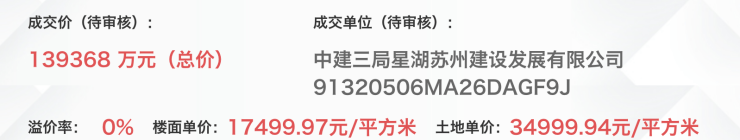 另根据苏州市国有建设用地使用权网上出让系统,位于工业园区夷浜路北、科智路西的苏地2023-WG-4号地块出让面积25451.45平方米,容积率1.5,建筑面积38177.2平方米,起始总价7.63亿元,起始楼面价20000元/平方米,最高上限价格8.78亿元,上限楼面价23000元/平方米。该地块经过2轮竞价,最终由苏州兆瑞房地产开发有限公司拍得溢价成交,成交价7.69亿元,成交楼面价20130.86元/平方米,溢价率0.65%。