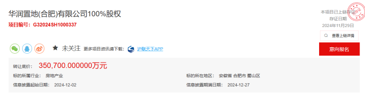 12月2日,据上海联合产权交易所披露的信息显示,超智资源有限公司挂牌转让华润置地(合肥)有限公司100%股权,转让底价约35.07亿元。