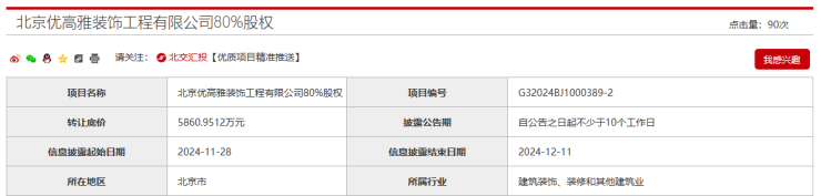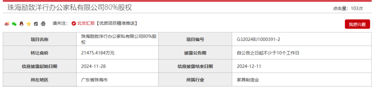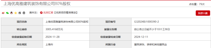 需要注意的是,上述项目需要和上海优高雅建筑装饰有限公司80%股权以及珠海励致洋行办公家私有限公司80%股权项目打包转让。上海优高雅建筑装饰有限公司80%股权转让底价约3005万元,珠海励致洋行办公家私有限公司80%股权转让底价约2.1475亿元。