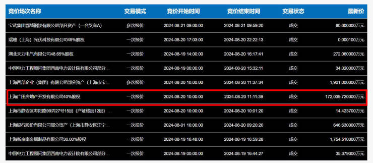 据上海联合产权交易所信息,国家电网旗下上海雅古项目管理有限公司持有的“上海广田房地产开发有限公司40%股权”挂牌交易。最新结果显示,该标的已于2024年8月20日以一次报价成交,成交价格约17.2亿元。