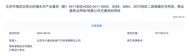 6月4日,北京海淀区1宗涉宅用地正式出让,从地块成交结果来看,该宗地块以低溢价成交,由北京华大基业房地产开发有限责任公司以79.17亿元竞得。