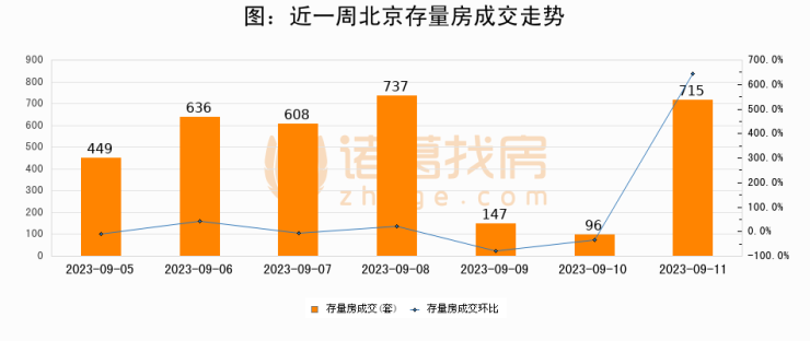 从存量房来看,2023年09月11日北京存量房单日成交715套,比昨日增加619套,环比上涨644.8%。从近一周存量房成交来看,北京存量房日均成交套数为484套,09月11日单日成交715套,高于近一周平均水平47.7%。