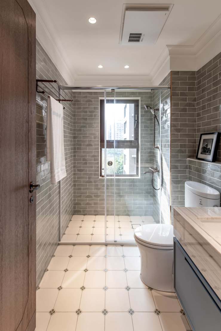浴室部分承襲公共空間的綠意,帶有若草綠的三角斜紋花磚與典雅地磚,搭配金屬古銅的淋浴設備,拼湊出經典復古的療癒世界。在抽屜部分,我們用心規劃可放置吹風機及盥洗用品的收納空間,連同插座部分也設置於抽屜內部,提供俐落完善的整體收納設計。主浴空間則是規劃雙洗手台設計,讓平日工作忙碌的男女屋主,在晨起能一同盥洗梳理,迎向美好的一日開始;入睡前,則輕聊閒談分享今日點滴,邁入溫暖夢鄉。