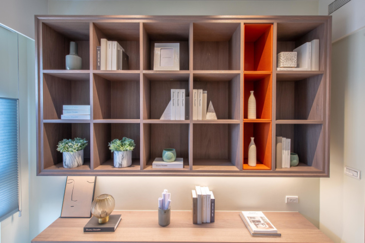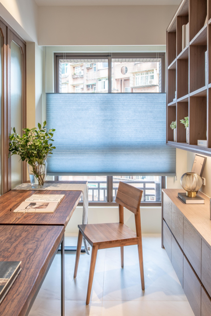 書房內部則運用大量胡桃木作為主要材質,低調內斂的實木貼皮與質感溫潤的湖綠藍風琴簾,創造出一個和諧空間,可以從中感受到安定與沈靜。跳耀強烈的波斯菊書架,則是讓人眼睛一亮的活潑點綴,為平靜生活帶來淘氣趣味。在櫃體的內部,我們特別設計貼心的子母抽屜,個人物品及文具也能妥善收納。