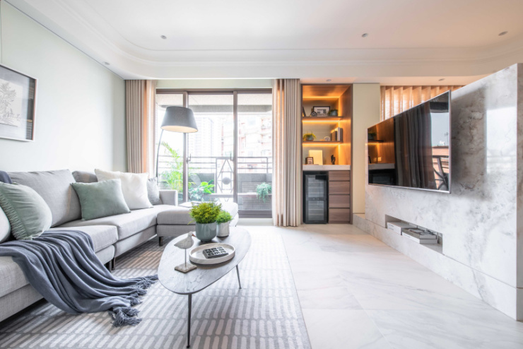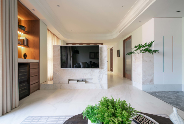 兩面充足的自然採光是這間房屋较得天獨厚的優勢,因此我們將光線的鋪陳作為設計的出發點。首先將沙發及電視牆的位置互換,改變原本一開門就見沙發的尷尬格局,讓主人能在客廳中享受飽覽全室的通透風景。為了實現女主人期望貼近大自然的綠意生活,我們將自然植栽引入屋內,選用帶有天然紋理的砂質粉麥色大理石來製作花器,融合面朝東的大片玻璃窗,提供一處充滿大量日光,適合沉澱放鬆的理想居所。
