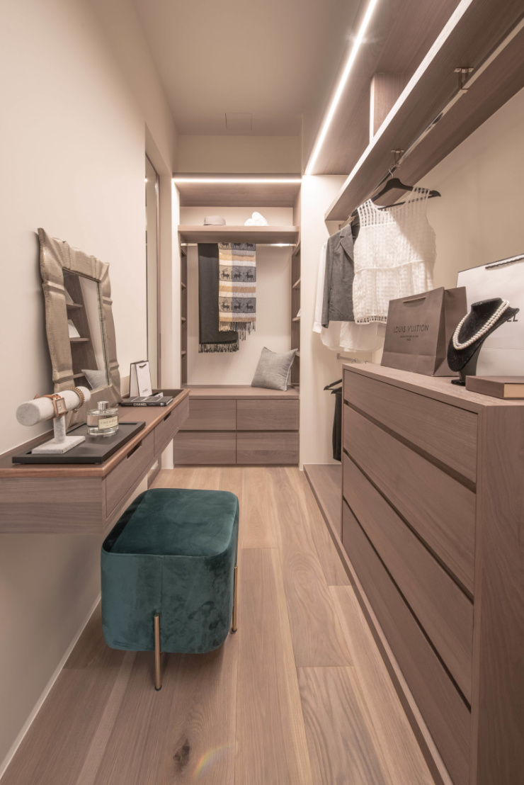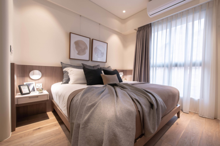 臥室延續溫暖木質調性,在床頭部分特別設計圓弧造型的立體床版,在塑造牆面造型的同時也是擺放私人小物品的貼心規劃,入眠前的閱讀眼鏡或是保養用品將不再處處尋覓。