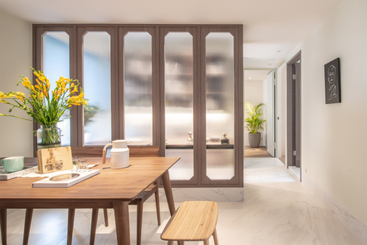 原本餐廳區後方為密閉式的客房隔間,為了營造空間的開闊感,我們選擇以書房替代客房,並利用大片透明玻璃來做區域分隔。玻璃部分採用條紋玻璃處理,一方面讓光線延續穿透,同時保有屋主所期望的獨立隱密性,成為沈靜思考的專注空間。