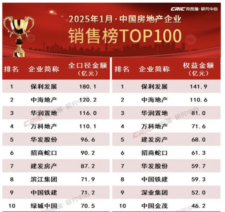 2月1日,克而瑞地产研究中心发布2025年1月房地产企业销售榜TOP100的情况。从销售额来看,保利发展(600048.SH)、中海地产(00688.HK,中国海外发展)和华润置地(01109.HK)位列前三,全口径销售额分别为180.1亿元、120.2亿元和116亿元。前十名中唯一的民企滨江集团(002244.SZ)全口径销售额为71.9亿元,排名第8。