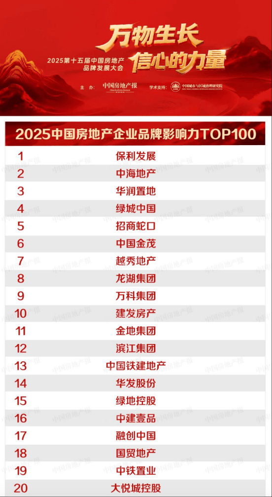 近日,由中国房地产报、中国城市与区域治理研究院主办的“万物生长 信心的力量——2025第十五届中国城市发展及房地产创新大会”在北京召开,会上隆重发布了“2025年中国房地产行业品牌影响力百强榜”,融创中国位列民营房企前三名。