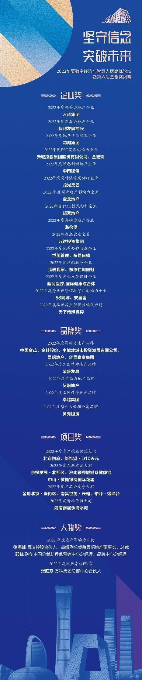 与此同时,作为《华夏时报》集全媒体之力打造的年度地产评选品牌,经过华夏地产专家委员会的多轮评选,2022年华夏数字经济与智慧人居高峰论坛暨第六届金瓴奖揭晓39个奖项,涵盖房地产企业、品牌、项目、人物等多个层面。