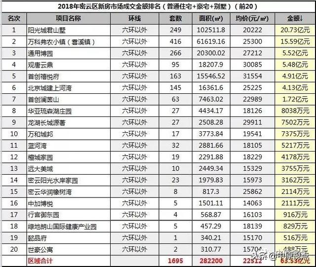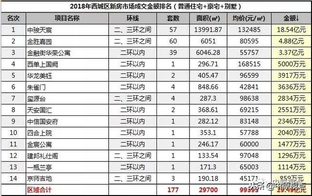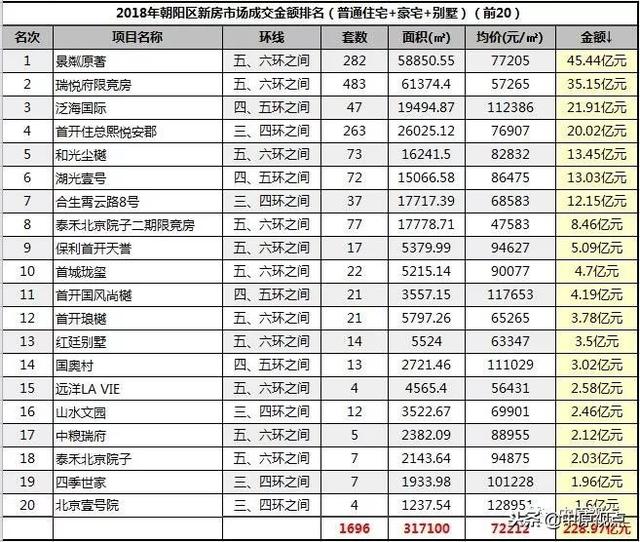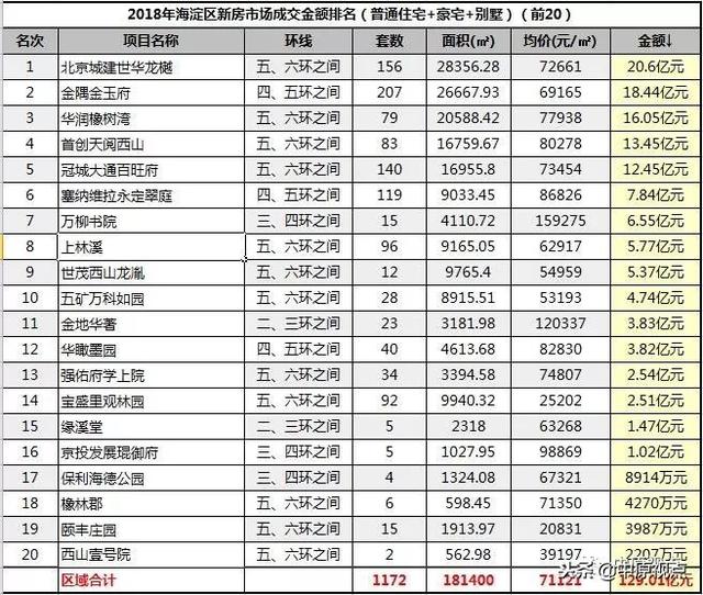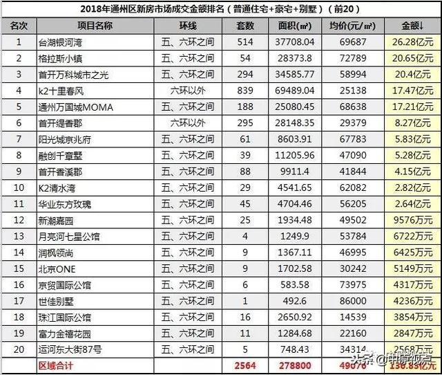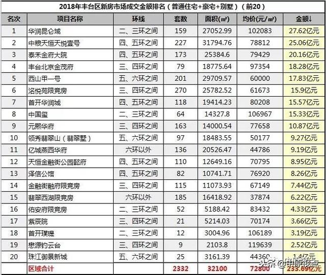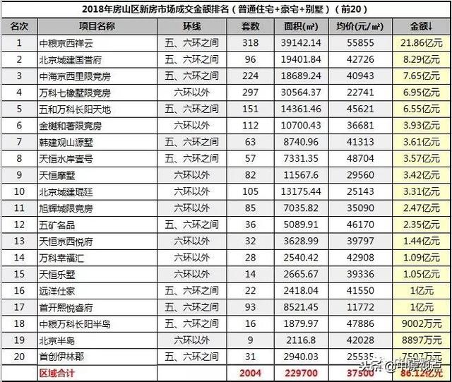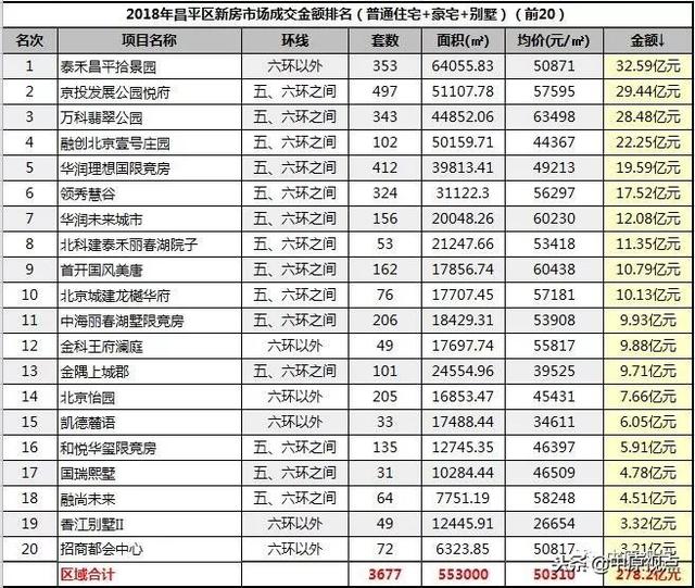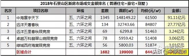 较新数据显示,在各楼盘表现上,景粼原著、瑞悦府限竞房、亦庄金茂府、泛海国际、首开住总熙悦安郡、北京城建世华龙樾、金茂逸墅、华润昆仑域、中粮天恒天悦壹号、泰禾金府大院、中海寰宇天下、远洋天著春秋、台湖银河湾、格拉斯小镇、首开万科城市之光、泰禾昌平拾景园、京投发展公园悦府、万科翡翠公园、融创北京壹号庄园院子、中粮京西祥云、西山燕庐、电建金地华宸、阳光城君山墅等23个楼盘成交额突破20亿元大关,其中仅1个限竞房楼盘。石景山的中海寰宇天下以91.11亿元的总成交额,成为2018年北京新房市场的年度销冠。这些热销项目主要集中在昌平、朝阳、丰台、通州等区域。