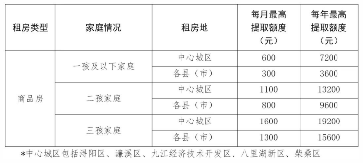 在提高多子女家庭租房提取住房公积金额度方面,《通知》提到,在九江市无自有住房且租住商品住房的二孩家庭,租房提取额度在现行租房提取住房公积金额度上每月提高500元,在九江市无自有住房且租住商品住房的三孩家庭,租房提取额度在现行租房提取住房公积金额度上每月提高1000元。
