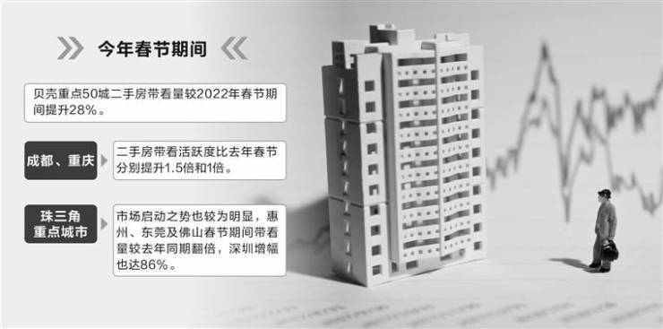贝壳研究院的数据显示,今年春节期间,贝壳重点50城二手房带看量较2022年春节期间提升28%。成都、重庆二手房带看活跃度比去年春节分别提升1.5倍和1倍。珠三角重点城市市场启动之势也较为明显,惠州、东莞及佛山春节期间带看量较去年同期翻倍,深圳增幅也达86%。