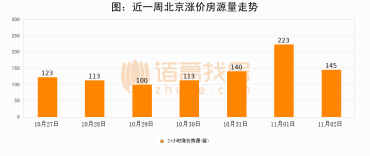 根据诸葛找房数据显示,北京24小时涨价房源量为145套,较11月01日减少78套,环比下降35%。与此同时,涨价房源占比小幅回落,对于购房者来说是一个入市窗口期,购房者可抓住时机入市。