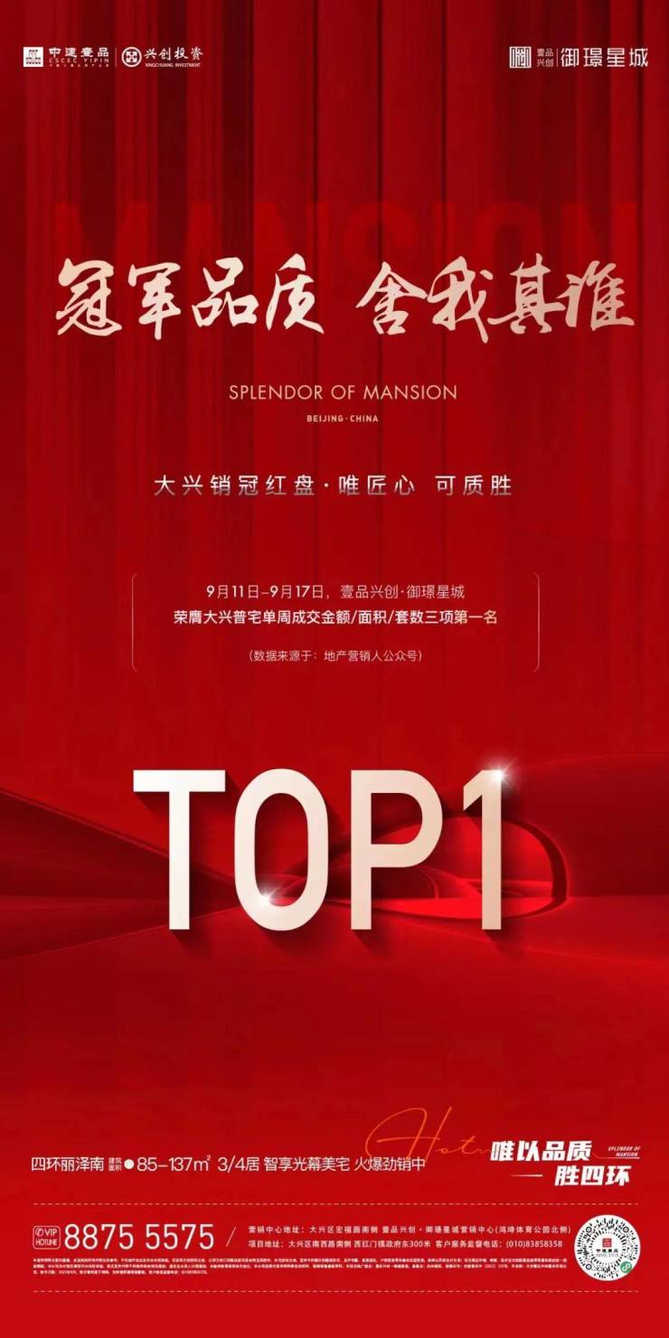 最近,项目的销售情况也不错,9月11日-9月17日,壹品兴创·御星城,荣膺大兴普宅单周成交金额/面积/套数三项第一名。(数据来源于: 地产营销人公众号)