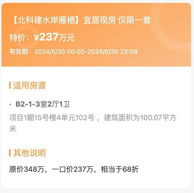 项目位于怀柔雁栖镇,约100平米特价房源,直降111万,折后总价约237万。