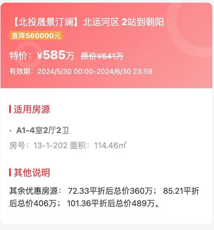 项目位于通州副中心北运河区域,距地铁6号线物资学院路站约2.5公里,2站即是朝阳区;约114平米特价房源,直降56万,折后总价约585万。