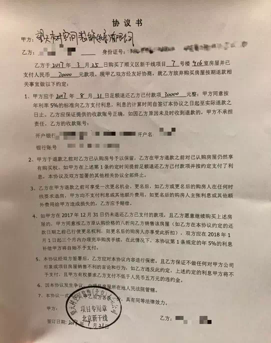 先来说房款,准业主们将大额购房款打到了北京望天树公司(北京新干线的承包商)大批业主们在326政策推出之后联系开发商要求退款,开发商先是一口答应全额退款,签订了退款协议,但是流程走的及慢。期间以各种理由推诿,在规定时间年内迟迟不补齐全部退款,严重耽误了准业主们造成了很大的损失。