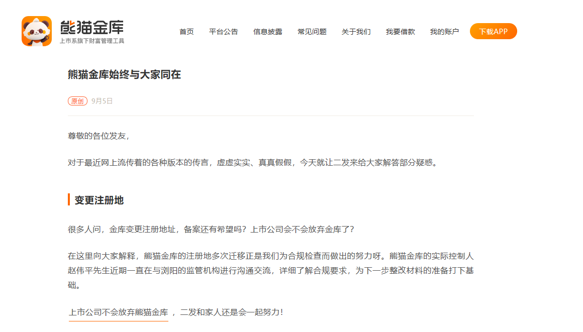 仅仅时隔半月,9月14日熊猫金控却发布公告称,拟将所持有的湖南银港咨询管理有限公司(即网贷平台“熊猫金库”运营主体)70%股权以5712.3万元的转让价格,转让给上市公司实控人赵伟平,“将抗风向能力较弱的熊猫金库进行剥离”。