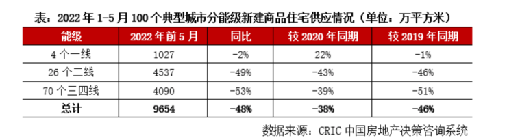 6月28日,克而瑞地产研究中心发布的报告显示,今年前5个月全国100个重点城市商品住宅新增供应面积9654万平方米,同比下降48%,创2019年以来同期新低。
