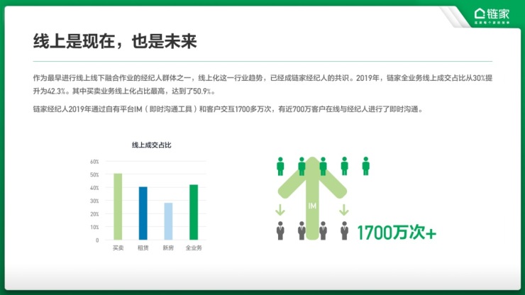 伴随着产业互联网的发展,线上化向房产领域的赋能越来越深入。作为较早进行“线上+线下”融合作业的经纪人群体,链家经纪人正在积极拥抱线上化趋势。报告显示,2019年,链家全业务线上成交占比从30%提升至42.3%。其中买卖业务线上化占比较高,达到了50.9%。