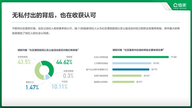 而提供社区服务也获得了大多数链家经纪人的肯定。调研显示,88.1%的经纪人认为社区便民助民及公益活动对自己的职业发展有帮助,其中较大的帮助是增加了经纪人的社会认同感。持续向社区提供价值,也在让经纪人收获更多的社会认可。