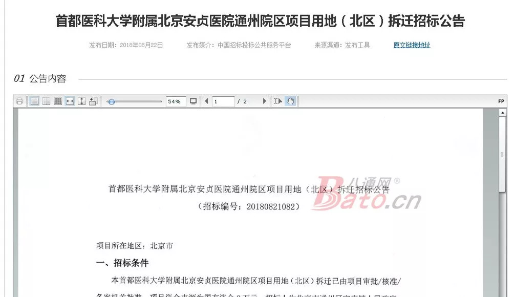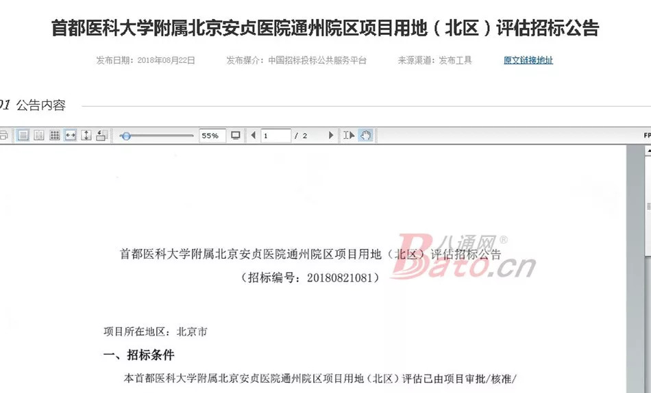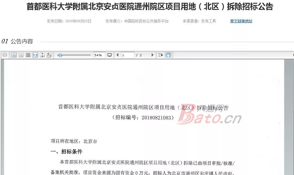 八通网(bjbato)获悉,近日,安贞医院通州院区项目用地(北区)拆除、拆迁、评估、测绘、审计等项目日前已开始进行招投标!