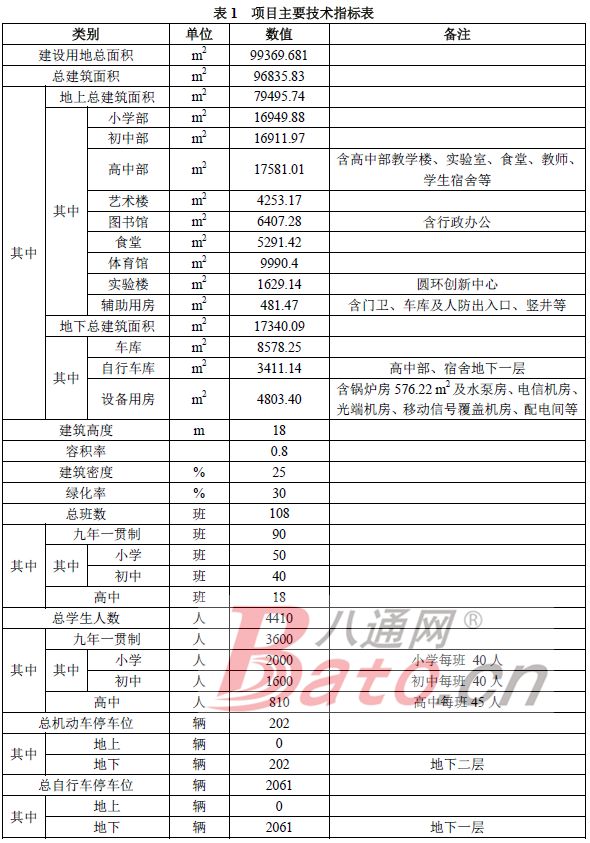 项目规划建设用地面积为99369.681平方米,建设用地性质为基础教育用地A33。拟新建总建筑面积为96835.83平方米,其中地上建筑面积为79495.74平方米,地下建筑面积为17340.09平方米,室外工程主要包括操场、篮球场、排球场、广场及道路、绿化、景观、室外照明、围墙、大门等。