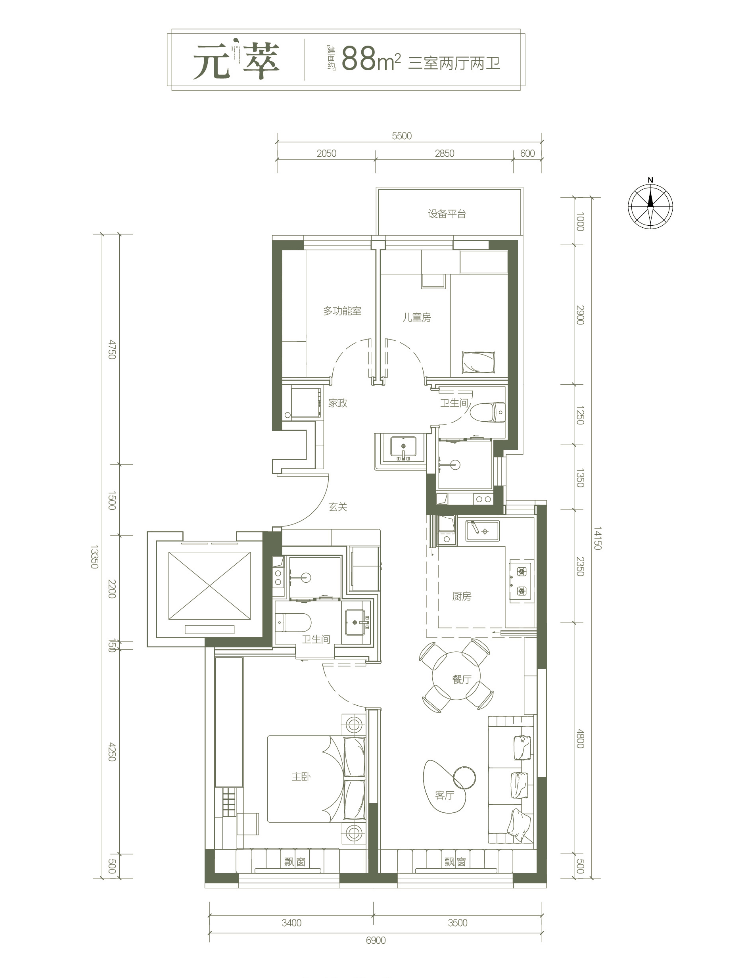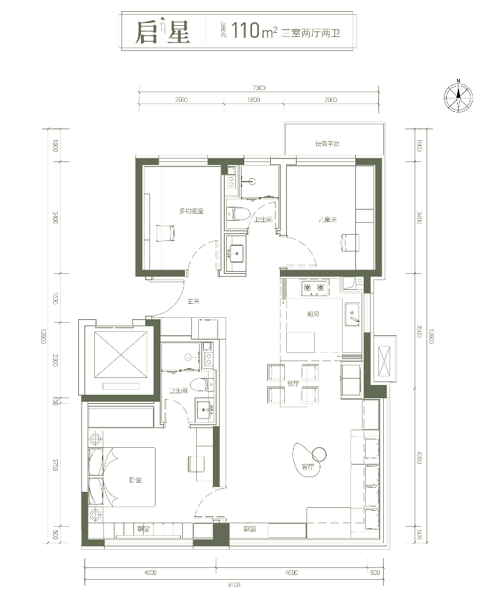 110平三居共195套房,两梯两户,入户独立玄关,南向主卧及独立卫生间,干湿分离,270°转角宽厅,南向面宽9.1米,L型厨房,独立家政间,北向两侧双次卧,中间客卫,三个房间互不干扰,私密性好。