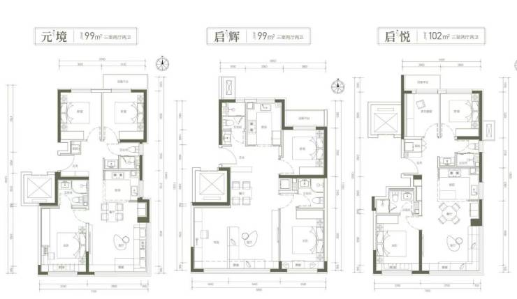 99/102平的三居双卫,三个户型共168套房,这个面积段跟玖玥府类似,因为一梯两户,得房率比两梯两户的玖玥府要高一些。
