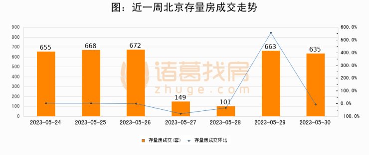 从存量房来看,2023年05月30日北京存量房单日成交635套,比昨日减少28套,环比下降4.2%。从近一周存量房成交来看,北京存量房日均成交套数为506套,05月30日单日成交635套,高于近一周平均水平25.5%。