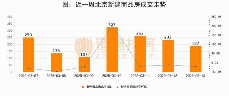 根据北京市住房和城乡建设委员会数据显示,2025年03月13日北京新建商品房成交187套,较昨日减少46套,环比下降19.7%。近一周北京新建商品房日均成交214套。03月13日单日成交187套,低于近一周平均水平12.6%。