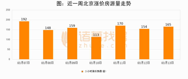 根据诸葛找房数据显示,北京24小时涨价房源量为165套,较03月12日增加11套,环比上涨7.1%。与此同时,涨价房源占比小幅扩大,业主信心有所提升。