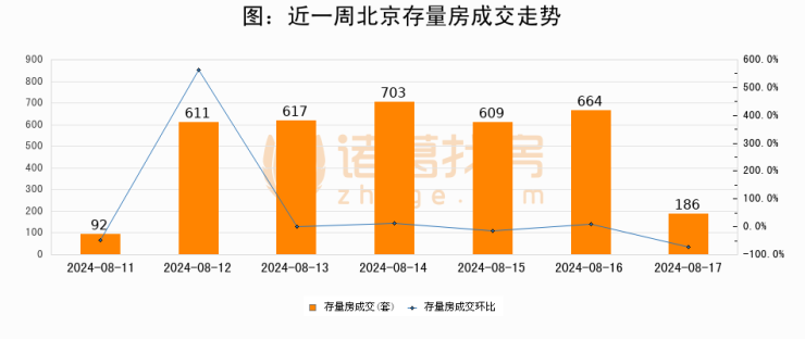 从存量房来看,2024年08月17日北京存量房单日成交186套,比昨日减少478套,环比下降72%。从近一周存量房成交来看,北京存量房日均成交套数为497套,08月17日单日成交186套,低于近一周平均水平62.6%。