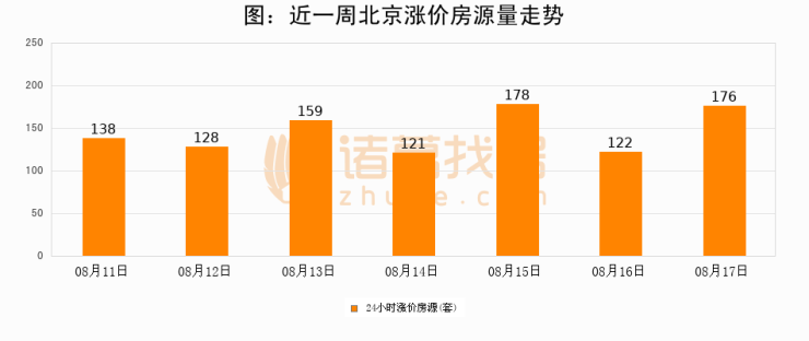 根据诸葛找房数据显示,北京24小时涨价房源量为176套,较08月16日增加54套,环比上涨44.3%。与此同时,涨价房源占比小幅扩大,业主信心有所提升。