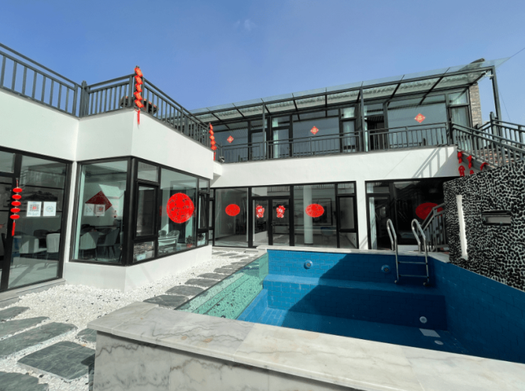 在范各庄村的东北角,三栋坐北朝南的二层中式小院格外显眼。记者推开庭院大门,小桥、流水、凉亭、绿植映入眼帘,宽大的落地窗为每个房间提供了充足的采光。整体的装修工作已经完毕,保洁员正在清扫铺满鹅卵石的走廊。