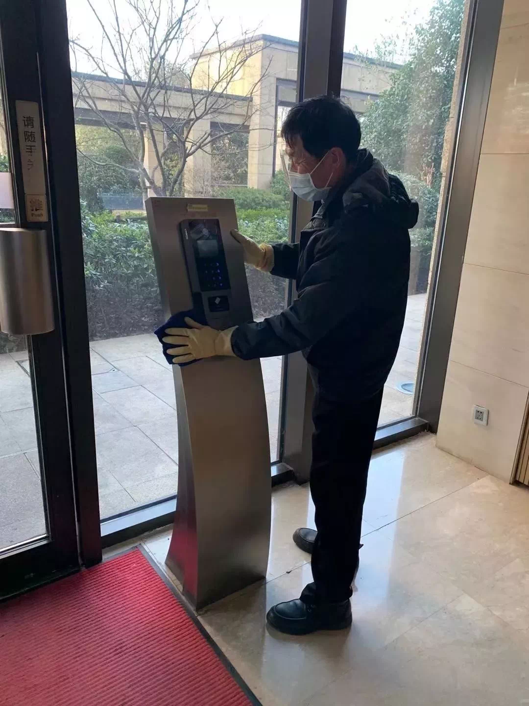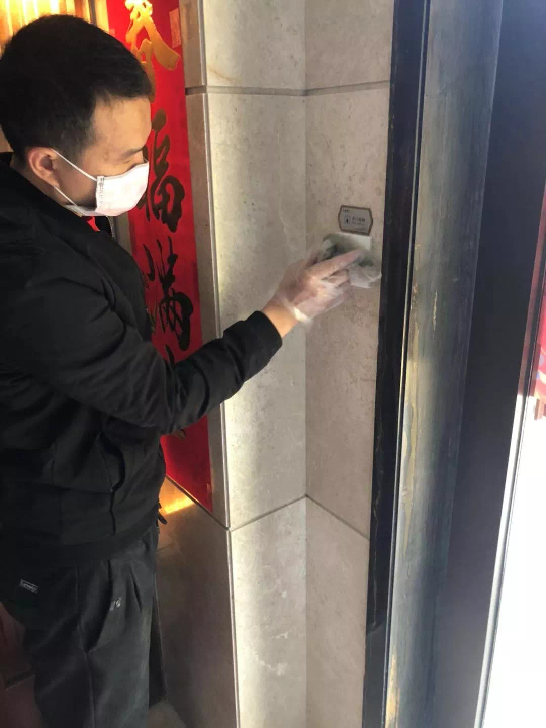 王小祥是海珀璞晖项目保洁主管。22台电梯、10几栋楼大堂、地下停车库、门岗、垃圾房……王师傅每天都要带着消毒喷枪、消毒水、消毒毛巾,奔走在社区的每一个角落。一大早,王小祥就开始了自己的忙碌日程。门岗、门洞、电梯厅;电梯按钮、门把手;社区公区、儿童游玩处……每处区域严格消毒完毕,每天要消耗近200片消毒片。忙完了消毒,王师傅要继续进行小区保洁工作。里里外外清扫一遍,王师傅要在小区里面走好几十圈,他的微信步数每天至少有2万步。只要他负责的区域,保证没有卫生死角,坚决不给病毒留机会!
