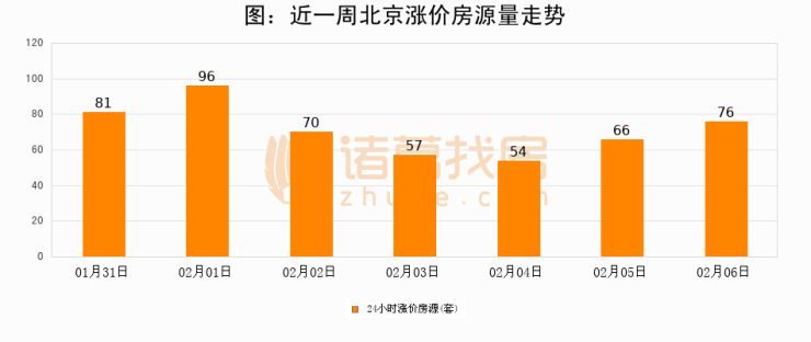根据诸葛找房数据显示,北京24小时涨价房源量为76套,较02月05日增加10套,环比上涨15.2%。与此同时,涨价房源占比小幅扩大,业主信心有所提升。