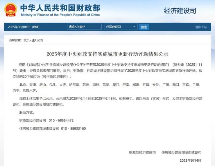 6月4日,财政部经济建设司、住房城乡建设部城市建设司发布《2025年度中央财政支持实施城市更新行动评选结果公示》,近日,财政部、住房城乡建设部组织开展了2025年度中央财政支持实施城市更新行动评选,拟支持的20个城市为:北京、天津、唐山、包头、大连、哈尔滨、苏州、温州、芜湖、厦门、济南、郑州、宜昌、长沙、广州、海口、宜宾、兰州、西宁、乌鲁木齐。