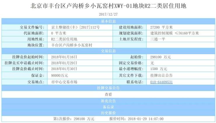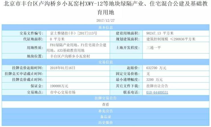 又见流拍!北京市丰台区卢沟桥乡小瓦窑村XWY-12等地块绿隔产业、住宅混合公建及基础教育用地,因无企业参与报名,流拍。