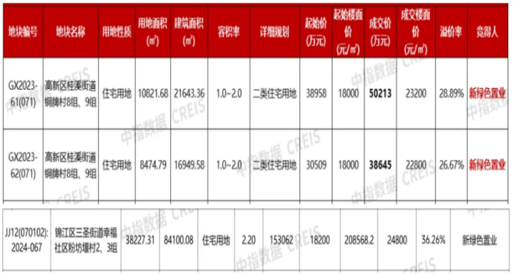 2024年4月9日,成都市高新区大源板块16亩地块经过53轮竞价,由新绿色置业以楼面价23200元/平方米、溢价率28.89%竞得;大源板块另一宗13亩地块经过48轮竞价,亦由新绿色置业以楼面价22800元/平方米、溢价率26.67%斩获。上述两宗地 块为连襟地块,均要求现房销售。值得一提的是,这两宗地块均刷新了交投于2022年7月12日摘得的桂溪街道地块楼面价(22500元/平方米),彼时占据了高新区楼面价前两位。