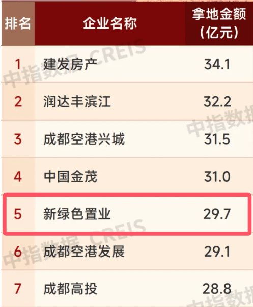 《每日经济新闻》记者注意到,在2024年成都土拍市场,民营房企新绿色置业堪称一匹黑马,全年共在成都拿下3宗热门区域的地块,以29.7亿元跃居成都房企拿地金额榜第五位,远超中海地产、保利发展等一众国央企。而2023年,新绿色置业的拿地金额尚未进入成都前30行列。