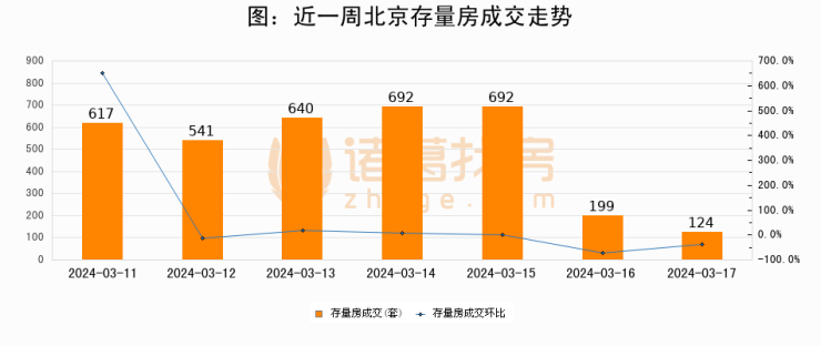 从存量房来看,2024年03月17日北京存量房单日成交124套,比昨日减少75套,环比下降37.7%。从近一周存量房成交来看,北京存量房日均成交套数为500套,03月17日单日成交124套,低于近一周平均水平75.2%。
