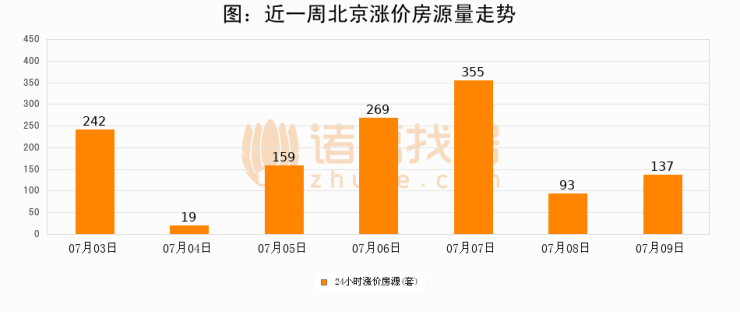 根据诸葛找房数据显示,北京24小时涨价房源量为137套,较07月08日增加44套,环比上涨47.3%。与此同时,涨价房源占比小幅扩大,业主信心有所提升。